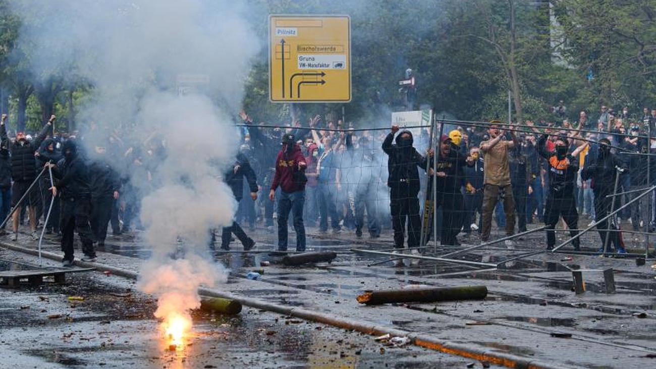 Dynamo dresden made it back to the second bundesliga on sunday, but the pictures in front of the stadium displace those of sporting success from inside.